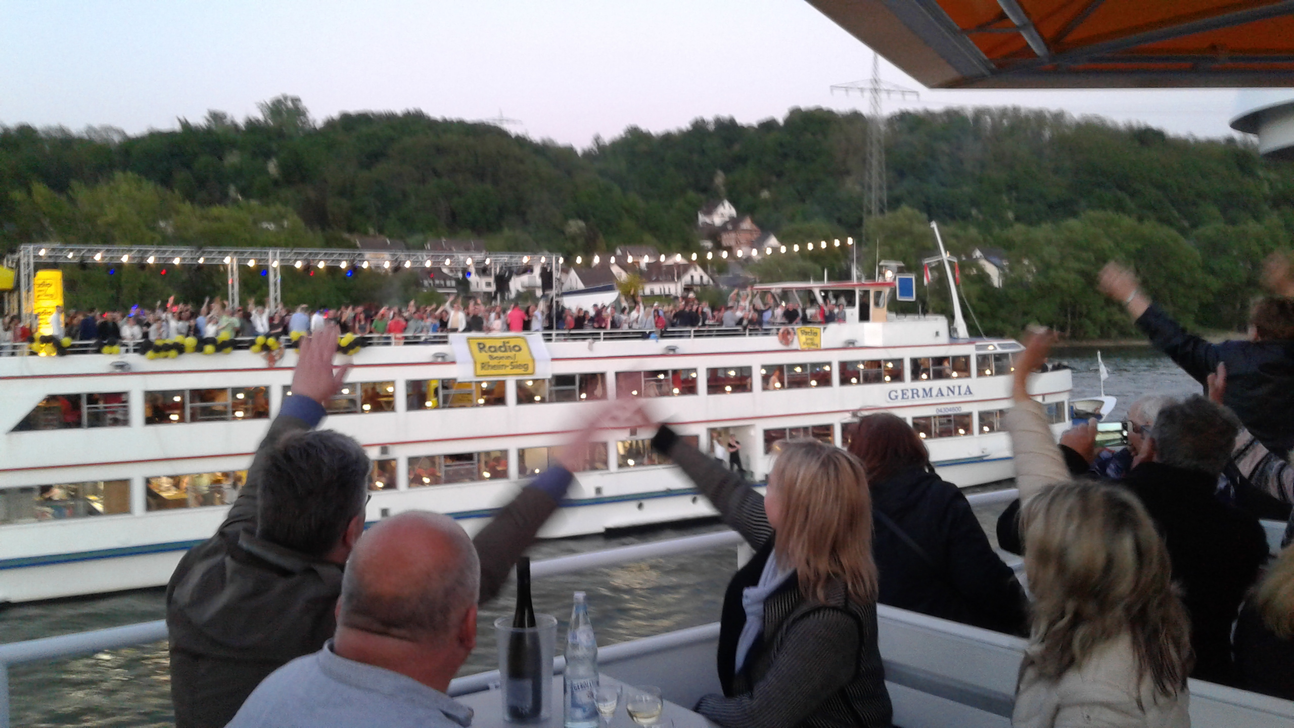 Notre bateau, le MS Vater Rhein, nous attendait sur les quais proches du campus universitaire et du parc du Deutsche Well à Bonn. Nous n’étions pas les seuls ! Au total 50 bateaux naviguent sur la portion entre Linz et Bonn à cette occasion unique. Le nôtre d’une longueur de 40m avec 2 ponts était l’un des plus beaux ; nous avions réservé 8 tables de 8 personnes sur le pont supérieur. Le bâtiment complet accueillait 250 personnes.